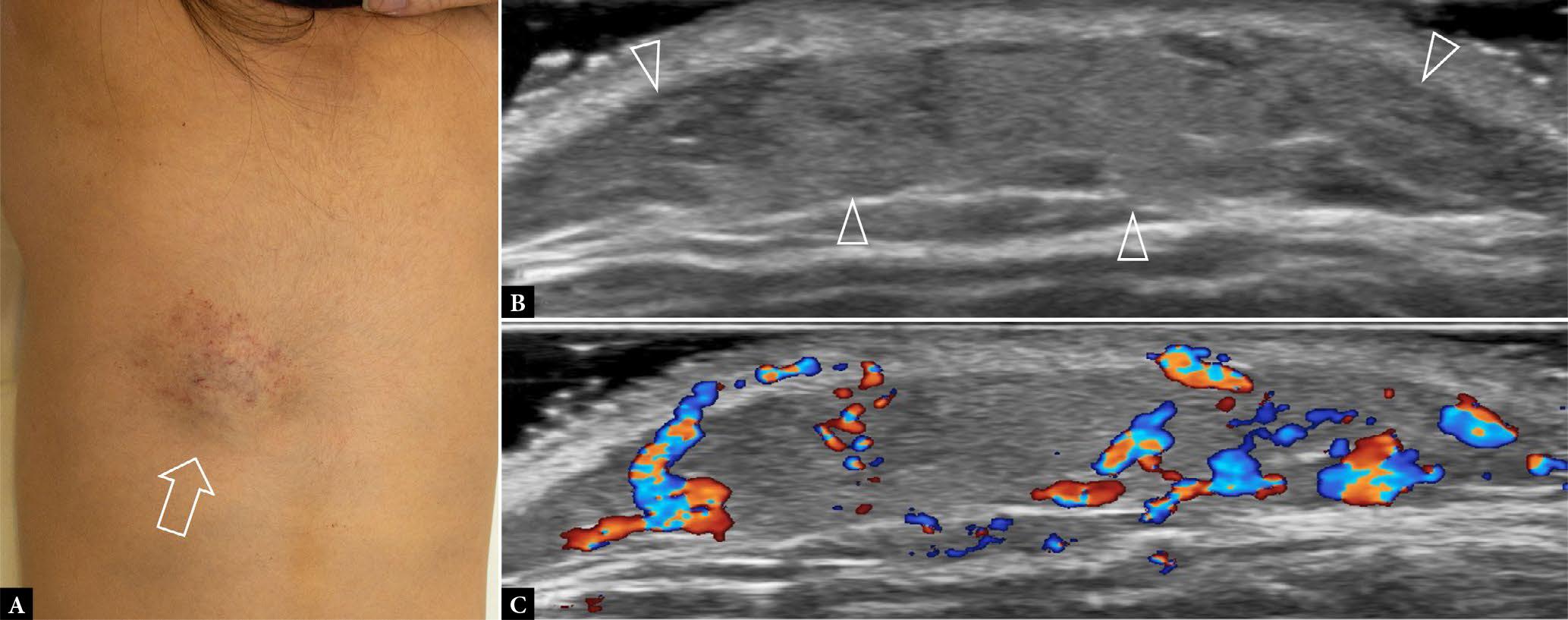 4-year-old female with mass, deep to colored birthmark on dorsal aspect of trunk, enlarging over the past two years A. Clinical photograph shows the site of mass (arrow). Transverse B. greyscale and C. color Doppler US shows a medium-sized moderately hyperemic vascular anomaly involving the skin and subcutaneous tissues (arrowheads), most likely either venocapillary vascular malformation or hemangioma. No deep extension present. Follow-up US will be performed in two years to assess for further commensurate growth (favoring vascular malformation) or involution (favoring hemangioma)