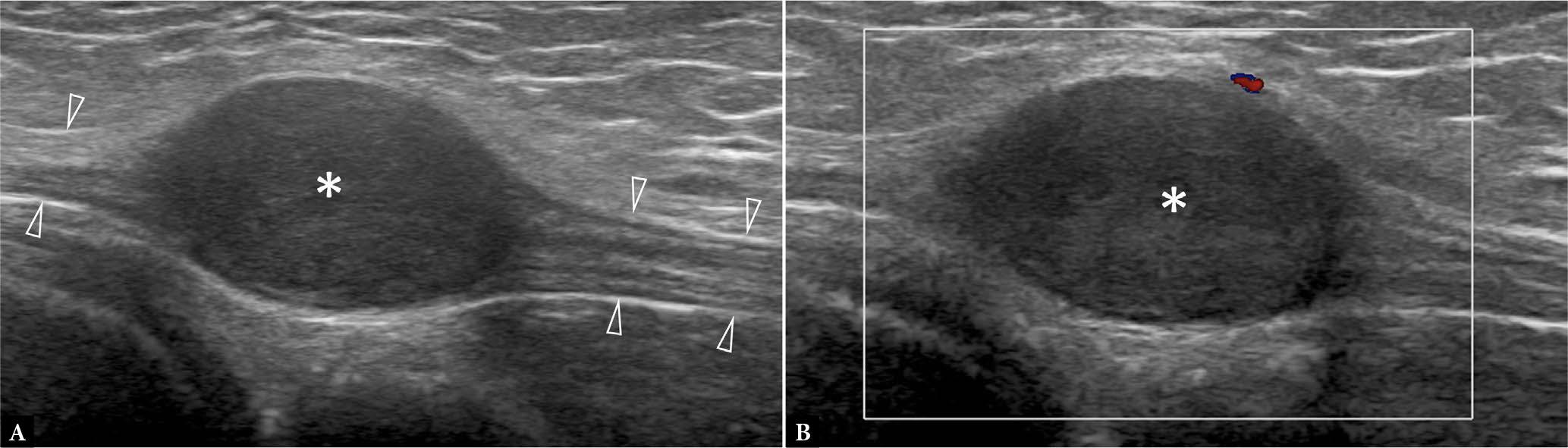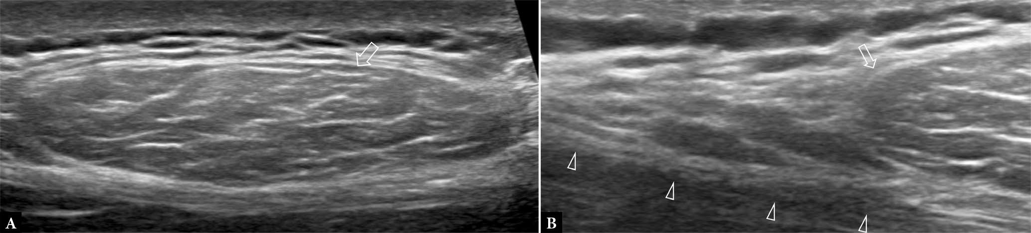44-year-old male with back lump clinically suggestive of lipoma. A., B. Transverse US shows a well-defined, oval-shaped, mildly compressible, mass (open arrow) with thin linear internal striations paralleling long axis of tumor. There was no demonstrable internal vascularity. The appearances are compatible with a subcutaneous lipoma. In this instance, as the tumor lies close to the investing fascia, the tumor margins (arrow) should be checked to confirm that the tumor is superficial to, rather than just deep to, the investing fascia (arrowheads). Subfascial lipomas have a higher risk of malignancy and, therefore, tend to be monitored and treated more actively than subcutaneous lipomas. An atypical lipoma would show features that look for the most part like a lipoma, though it has areas where the fine linear striations may not be readily apparent, and may have areas of calcification or areas of hyperemia