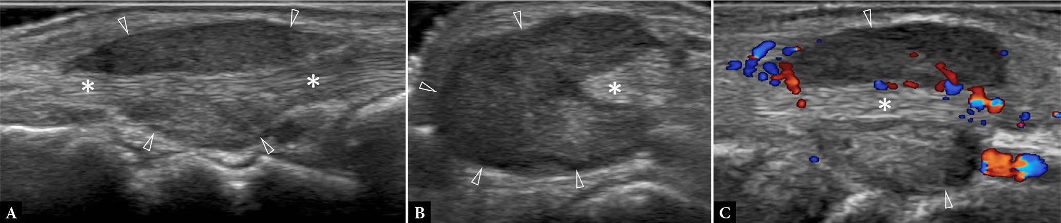 62-year-old female with slow-growing radial-sided wrist mass for two years. A. Longitudinal, B. transverse greyscale and C. longitudinal color Doppler US show a soft tissue mass (arrowheads) surrounding the 1st extensor compartment tendons (*), compatible with giant cell tumor of tendon sheath (GCTTS). Dynamic ultrasound can help to exclude intratendinous extension. GCTTS was confirmed on surgical excision