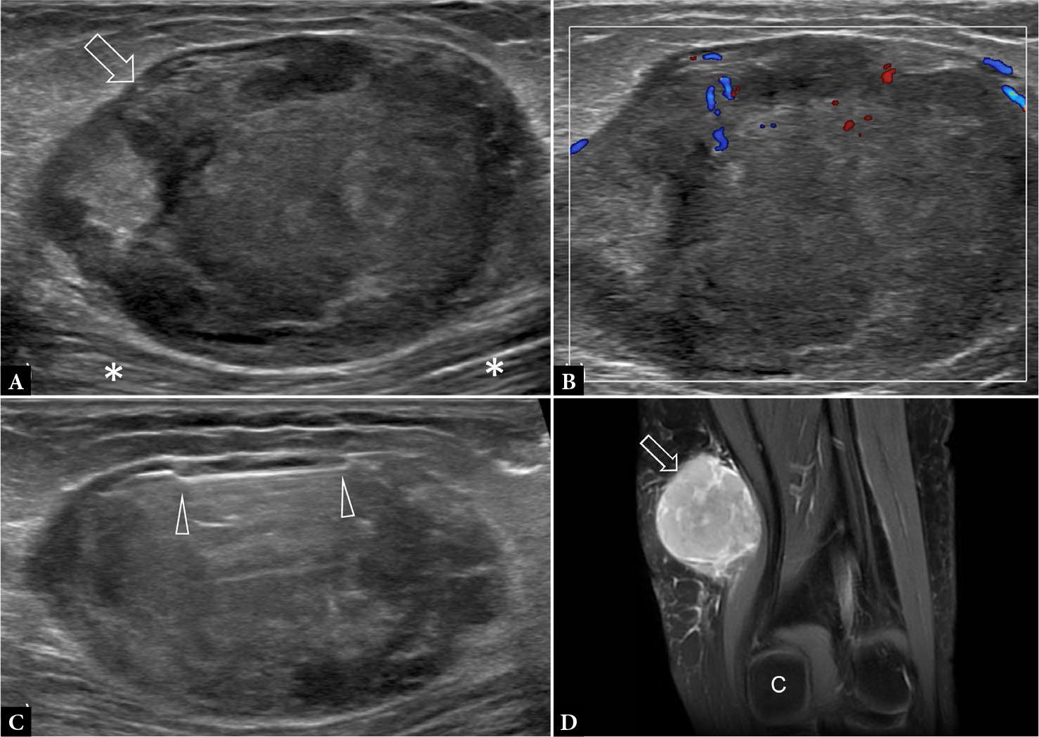 47-year-old female with slow-growing distal thigh mass for two years. Longitudinal A. greyscale and B. color Doppler US show a large well-encapsulated mildly hyperemic tumor (arrow) located between the investing fascia and the sartorius muscle (*). The overall appearance favored sarcoma. C. US image obtained during percutaneous biopsy shows sampling from the immediate subcapsular area of tumor (arrowheads). Histology was compatible with synovial sarcoma. D. T2-weighted fat-suppressed coronal MR image shows tumor (arrow) located proximal to medial femoral condyle (C) displacing the sartorius muscle deeply. Wide excision was performed with a 2 mm rim of muscle. No muscle invasion was present