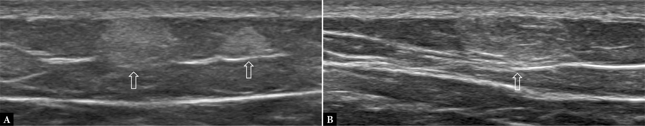 41-year-old male with multiple, occasionally painful, subcutaneous lumps in the abdominal and thigh regions. A., B. Longitudinal US shows three variably-sized small echogenic masses (arrows) consistent with multiple subcutaneous lipomas (Dercum disease). Overall, there were more than twenty such lipomas present. When multiple lipomas exist, such as in this case, the lipomas tend to be more rounded, more echogenic, and have less pronounced internal striation and encapsulation than solitary lipomas