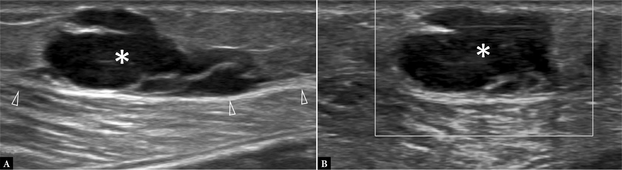 52-year-old male with a three-year history of slow-glowing medial ankle mass. Longitudinal A. greyscale and B. color Doppler US show a medium-sized nerve sheath tumor (NST) (*) arising concentrically from the tibial nerve (arrowheads). No tumoral vascularity was evident. Only 50% of NSTs have discernable neural continuity on US. Neural continuity may not be seen when NSTs arise from very small peripheral nerves