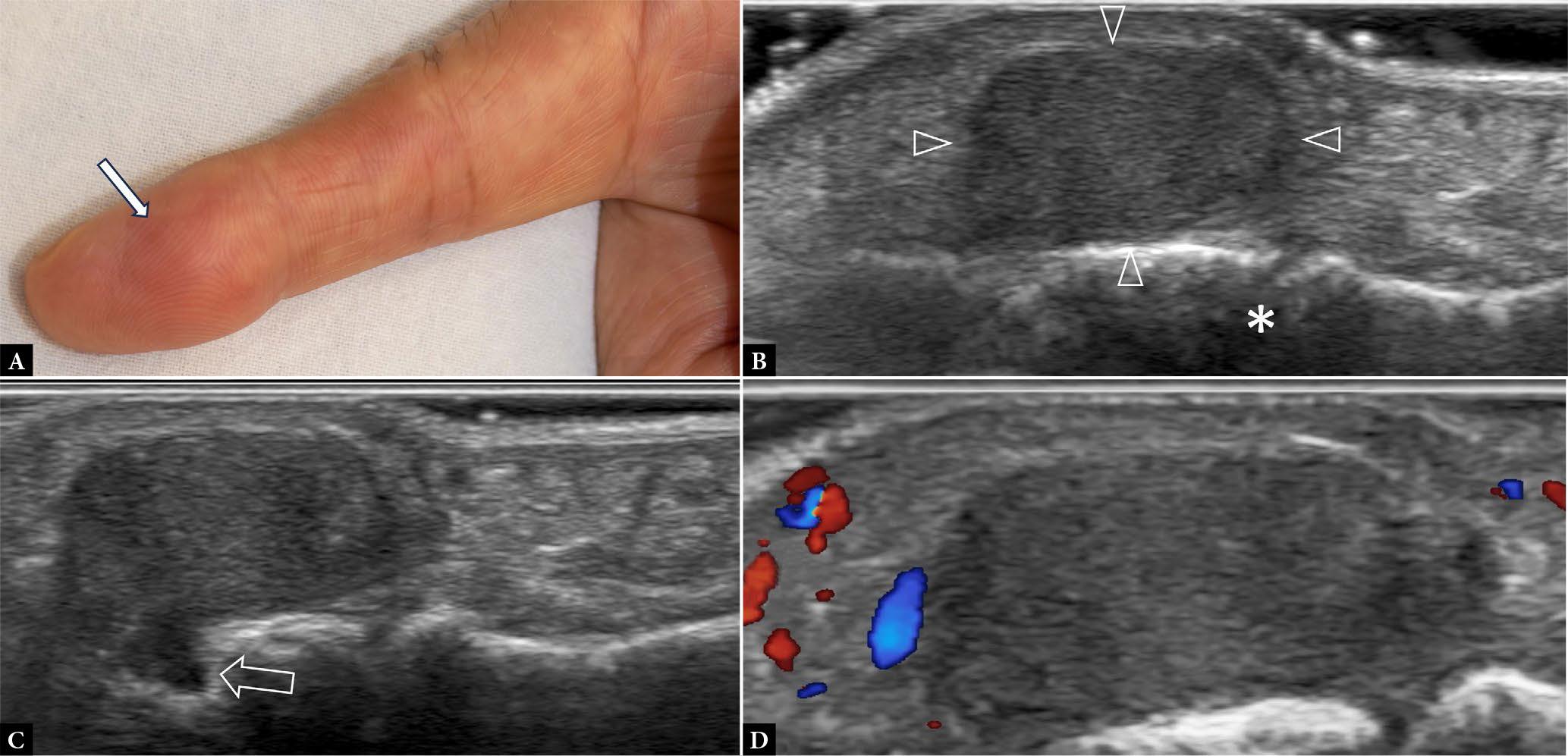 72-year-old male with painless lump in the apical pulp space of the index finger, which was slowly enlarging for one year. A. Clinical photograph shows the mass (arrow). Longitudinal B, C. greyscale and D. color Doppler US show a well-defined medium-sized mass (arrowheads) in the apical pulp space. The mass extends to, but does not definitely involve, the distal interphalangeal joint (DIPJ) (*). The mass seems to extend into a small cortical defect (open arrow) of the distal phalanx. No tumoral vascularity was evident. Overall, in view of possible intracortical extension, nerve sheath tumor was considered more likely than giant cell tumor tendon sheath (GCTTS) or glomus tumor. MRI and US-guided biopsy were recommended. MRI will help clarify the extent of the mass and possibility yield more information on the nature of the mass, such as hemosiderin deposition in GCTTS. Biopsy will help confirm the nature of the mass, which will help surgical planning