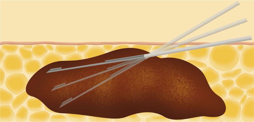 Schematic diagram showing the approach for percutaneous needle biopsy. The co-axial tip is placed just deep to the capsule, enabling it to be more easily directed to target different tumor areas. For suspected STS, samples should be preferentially obtained from area immediately deep to the capsule as well as any vascular areas rather than the central areas, which tend to be more necrotic