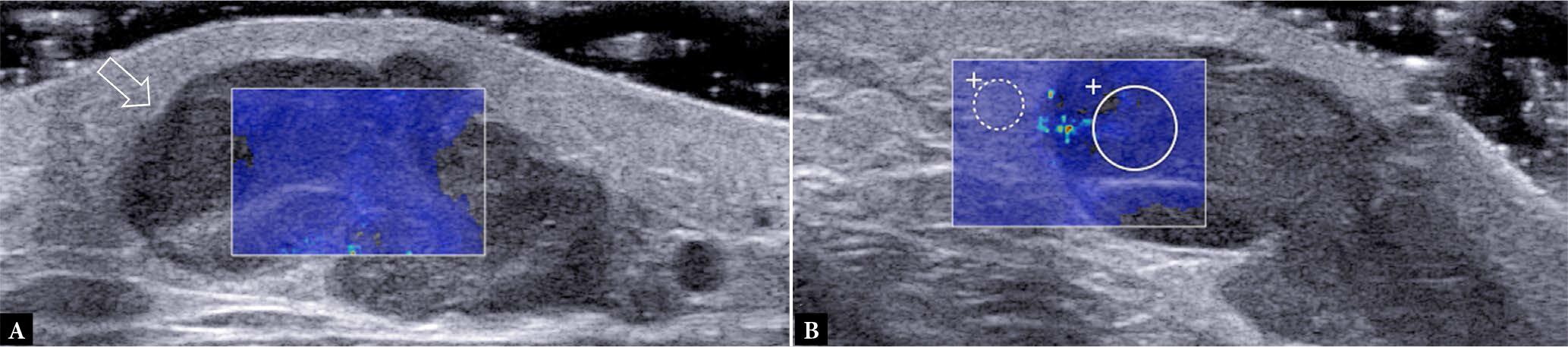 57-year-old man with known subcutaneous recurrence of high-grade sarcoma (arrow). Shear wave elastography (SWE) shows that the known sarcoma recurrence is nearly entirely blue i.e. comprising hard tissue. Mean SWE modulus was 18.8 kPa. SWE ratio with subcutaneous fat (dashed circle) was 1.49. Elastography measures are not useful at differentiating benign soft tissue masses from sarcoma. Both these SWE modulus and ratio values can be observed in benign tumors, such as epidermoid cysts