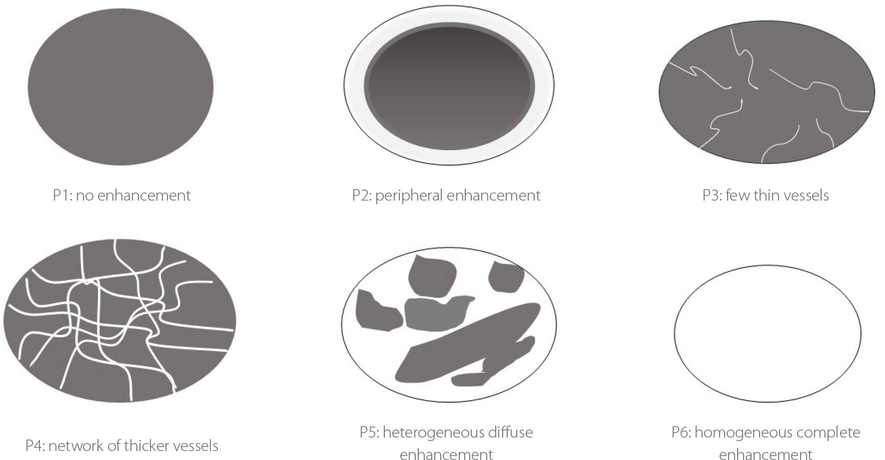 Perfusion pattern types seen on CEUS. P1 (no enhancement) is characteristic of benign tumors. P2, P3, and P4 are non-discriminatory. P5 or P6 (marked enhancement) are more common in malignant tumors