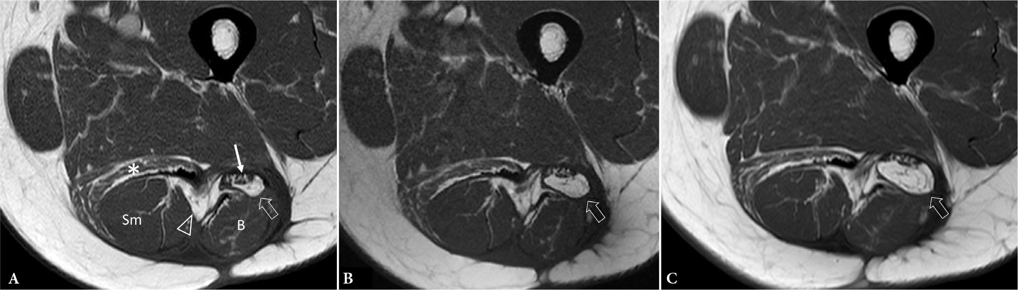 63-year-old male following resection of well-differentiated liposarcoma posterior aspect thigh. T1-weighted (T1W) axial MR images thigh A. nine months post-operation shows severe semitendinosus muscle atrophy (*), increased intermuscular fat (arrowhead) between semimembranosus (Sm) and long head biceps femoris B. muscles as well a fatty mass (volume 1.6 ml) (open arrow) posterior to sciatic nerve (arrow). B. Fourteen months post-operation, the fatty mass posterior to sciatic nerve had increased by 143% (volume 3.9 ml). C. Nineteen months post-operation, the fatty mass posterior to sciatic nerve had further increased by another 130% (volume 9 ml), compatible with liposarcoma recurrence. MRI is generally better than US for post-operative surveillance. Volume, rather than linear, measurements provide a more ready appreciation of changing tumor size. In this case, volume measurements were made by formulaic estimation (length × width × depth × 0.52) rather than tumor segmentation