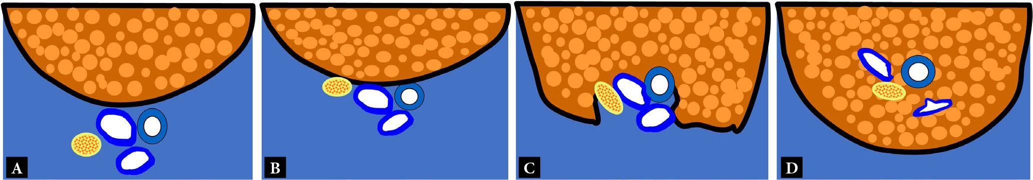 Schematic representation of NVB involvement. The NVB is resectable when it is A. not in contact with or B. just contacts the tumor margin. C. When the NVB is partially encased by tumor it is still usually resectable. D. When the NVB is completely encased by tumor, it is non-resectable, though exceptions may occur in some well-differentiated liposarcomas (Fig. 20)