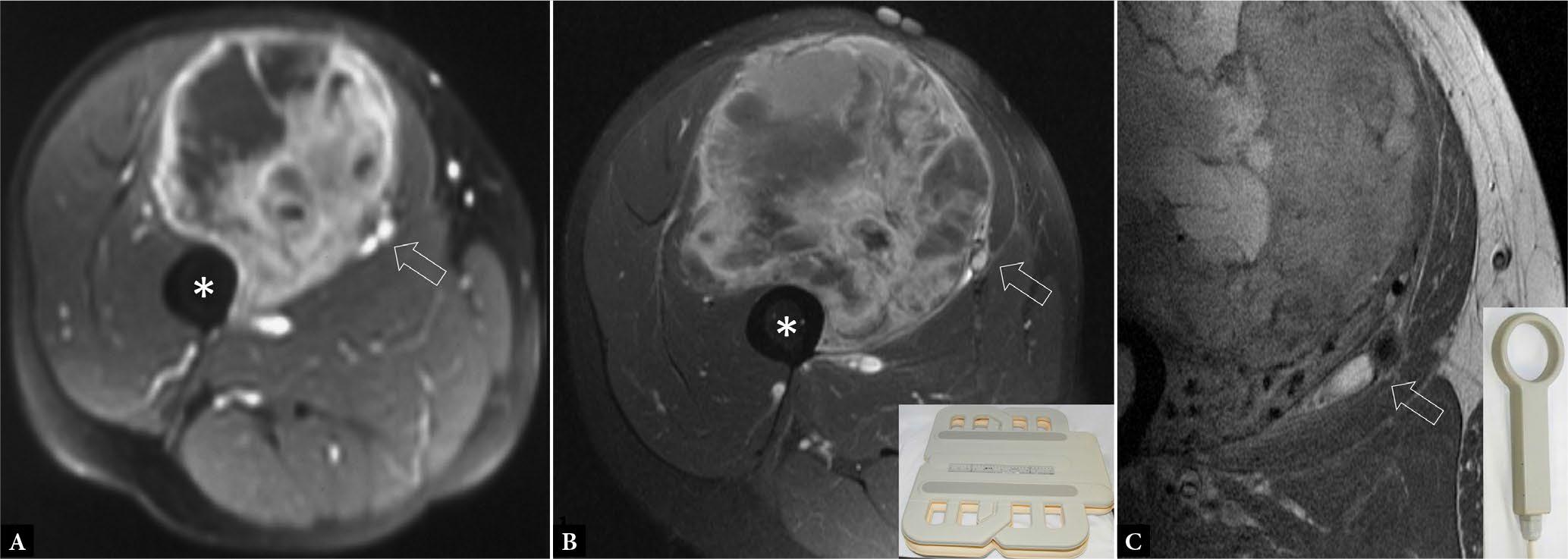 55-year-old female with biopsy-proven undifferentiated pleomorphic sarcoma of thigh. A. T2-weighted fat-suppressed (T2W FS) axial MR image thigh shows a large soft tissue tumor in the anterior compartment contacting the cortex of the femoral shaft (*). It was uncertain whether the femoral vessels (open arrow) were involved by tumor. B. T2W FS axial MR image thigh with surface coil (inset) shows clearer delineation of femoral vessels (open arrow), which do not seem to be infiltrated by tumor. C. Proton-density-weighted (PDW) axial MR image with microscopy coil (inset) shows femoral artery and vein (open arrow) unequivocally not involved by tumor. Use of different MR techniques enables more confident assessment of NVB infiltration