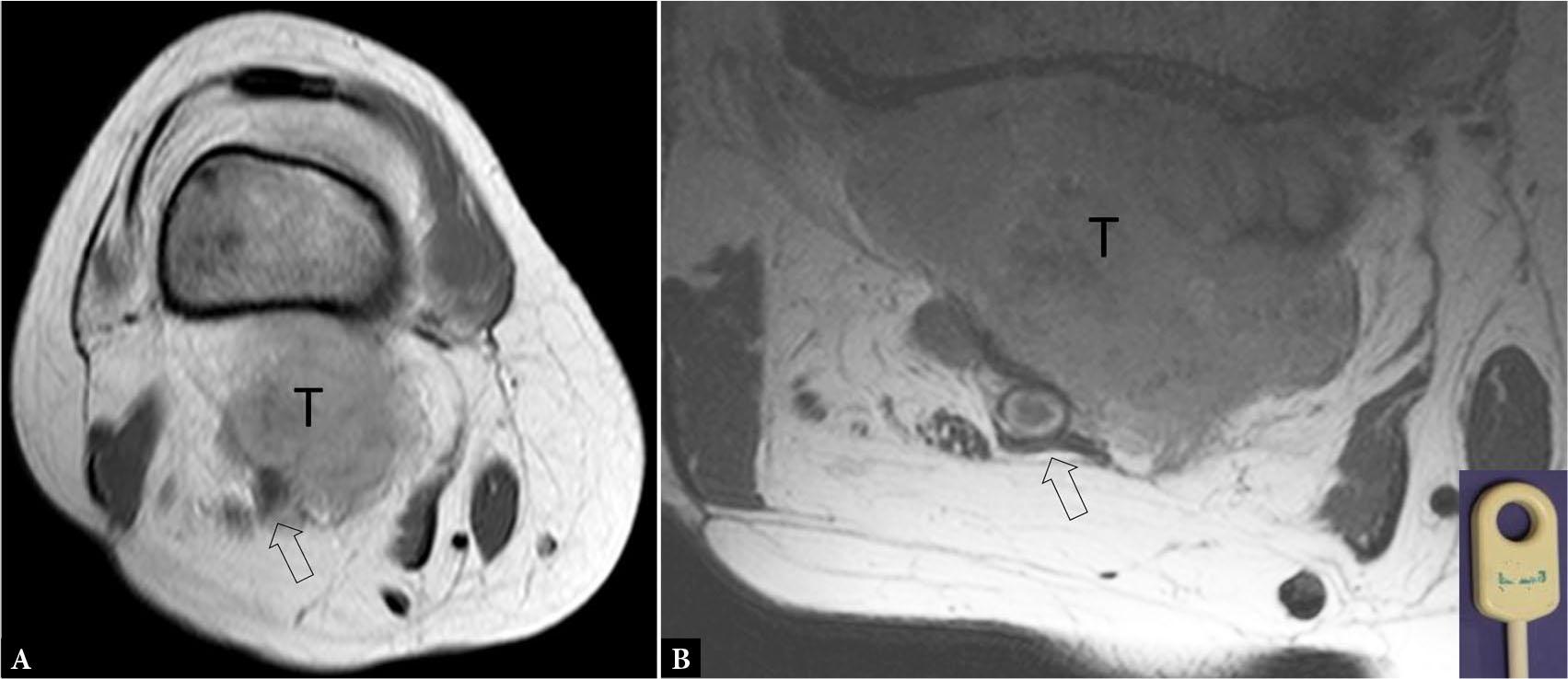 72-year-old male with biopsy-proven malignant fibrous histiocytoma of the popliteal fossa. A. PDW axial MR image with standard coil shows possible partial encasement of the popliteal artery (open arrow) by tumor (T). A, B. PDW axial MR image with microscopy coil (inset) shows the popliteal artery (open arrow), vein, and tibial nerve to be clearly separated from tumor (T)