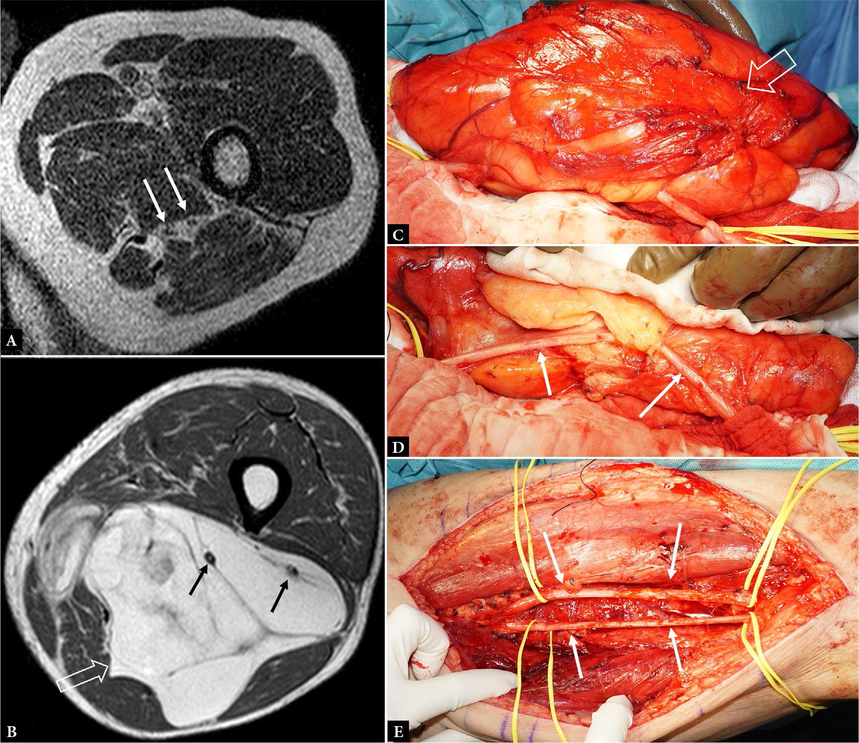 78-year-old male with well-differentiated liposarcoma of the thigh. Axial T1W MR image shows A. a high division of the sciatic nerve into the tibial and peroneal nerves (arrows) and B. a large intermuscular liposarcoma (open arrow), between the adductor and hamstring muscle groups, encasing the tibial and peroneal nerves (arrows). C.-E. Clinical photographs of surgically exposed tumor (open arrow) showing the invaginated tibial nerve (arrows) which, for the most part, easily freed from the tumor pseudocapsule. As the tibial nerve was focally tethered in the mid-portion of the tumor, the epineurium in this area was resected. The exposed nerve fibers were not visibly infiltrated by tumor. E. Preserved tibial and peroneal nerves (arrows) after complete tumor resection. Histologically, the tethered small segment of the tibial nerve had epineurial tumor involvement. Three years after resection, the patient has no local recurrence