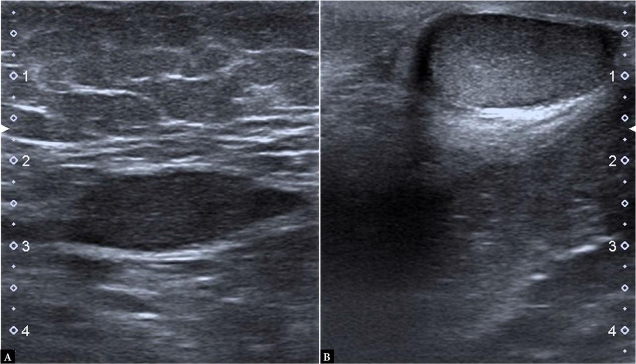 Gray-scale ultrasonography images in a 120-month-old boy. A. Deep plane undescended testis with reduced echogenicity and dimensions in the right inguinal canal. B. Image of left testis with normal echogenicity, located in the scrotum