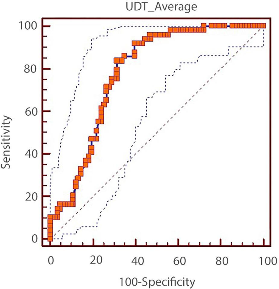 We used the ROC curve to define an interrupt SWE value that predicted decreased testicular echogenicity using average SWE values. The area under the curve for the UDT was 0.78 (95% CI: 0.70–0.85, sensitivity 83.7%, specificity 68.7%, p <0.001), with an average SWE value of 2.32 (m/s) for above the cut-off point indicates