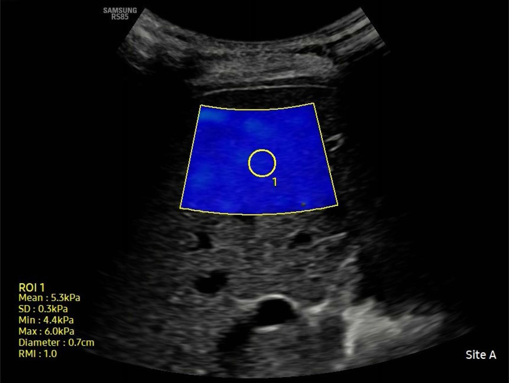 All SWE examinations were performed using a single device (RS85 Prestige, Samsung Medison Co. Ltd.) with a convex transducer (5 MHz) by the same radiologist. Patients were evaluated in a supine position with their right arm abducted. After instructing the patients to relax and remain in a neutral breathing position, the best intercostal space was used for assessment. SWE images were captured on grayscale ultrasound images within a rectangular region of interest (ROI) at least 2 cm from the liver capsule, taking care to avoid large vascular structures and bile ducts. Liver stiffness measurements were performed ten times. The median value was recorded. The results were expressed in kilopascals (kPa), accompanied by an autocalculated reliability measurement index to assess the confidence in each measurement. Since the reliability of measurements with RMI ≥0.8 and interquartile range (IQR)/median (Med) ≤30% was found to be high, these reference values were used in the study(17,18) (Fig. 1). HS was graded as 1, 2, and 3 (mild, moderate, and severe) based on findings commonly assessed in USG, such as liver parenchymal structure and echogenicity, and the clarity of the diaphragm and hepatic vessels(19). The midclavicular line was determined to measure the size of the liver.