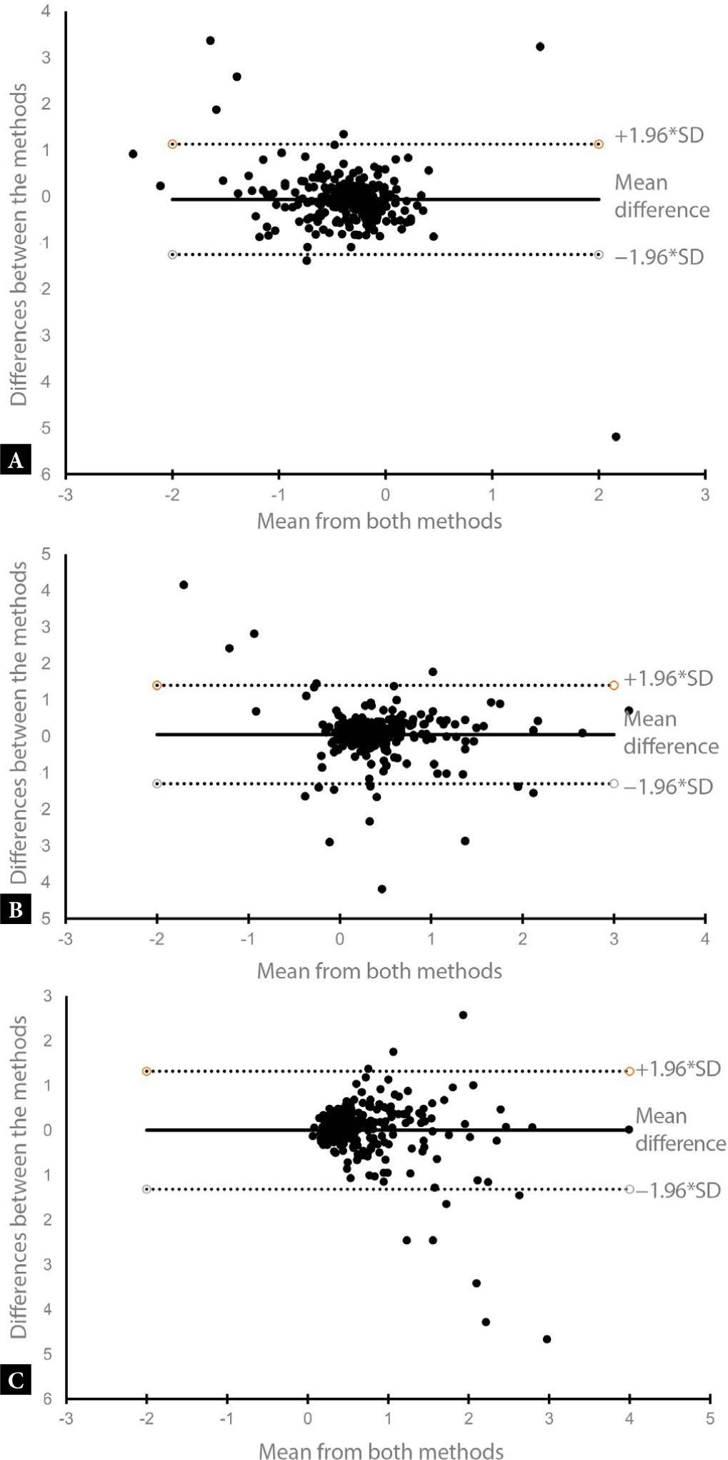 Bland-Altman plot for parameters ΔH, ΔD and vector – PFS TV vs. PFU-TA: A. ΔH. B. ΔD. C. Vector