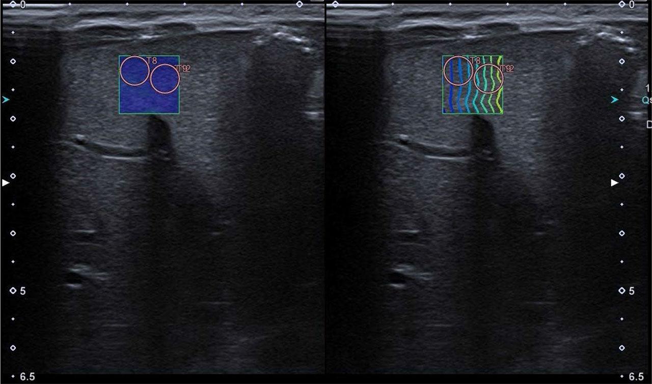 An exemplary SWE measurement of the right liver lobe with a color-coded map and a wave propagation map, two ROIs are marked