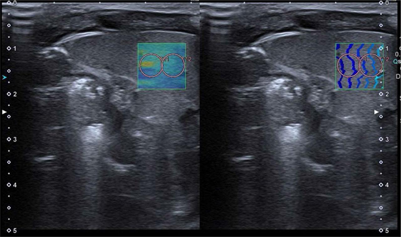 Hepatic, splenic and renal elasticity was measured using the 2D-SWE method during an ultrasound examination (the same device and transducer used for B-mode US), with Canon Aplio i600 system, a14L5 linear transducer (10 MHz), neonatological preset, in spontaneously breathing newborns. A minimum food intake interval of 60 minutes was required. The liver and spleen were assessed with the newborn in the supine position. The right hepatic lobe was assessed under the right costal arch or in the right intercostal space, the left hepatic lobe was assessed in the midline, under the costal arch, achieving optimal transducer placement. The spleen was examined in the left intercostal space or under the left costal arch, achieving optimal transducer placement. The kidneys were assessed in the prone position, from the dorsal side, in the middle part of the kidney, in the view transverse to the long axis. The transducer was placed perpendicularly to the surface of the examined organs, avoiding additional pressure with the transducer. Before taking measurements, a color-coded uniform area of the measurement map (elastogram) was determined using the wave propagation map (option available in the device). The measurements were done below the organ capsule, with the ROI placed within the elastogram so that it was filled with a uniform color, and with wave lines arranged in parallel, equally spaced on the propagation map. The above steps were repeated to obtain a series of 5 measurements (ROI). The ROI size was 5 mm for the right and left lobes of the liver, spleen and kidneys. Examples of 2D-SWE examinations of the right and left lobes of the liver, spleen and kidney are illustrated in Fig. 1, Fig. 2, Fig. 3, Fig. 4. In the kidney examination, the ROI included the renal parenchyma (cortex and pyramid) in such a way that the position of the pyramid (long axis) was parallel to the US beam, excluding the lumens of the calyces and the renal pelvis. The results for each organ were obtained based on the calculation performed by the application installed by the manufacturer in the US device, based on a series of 5 measurements.