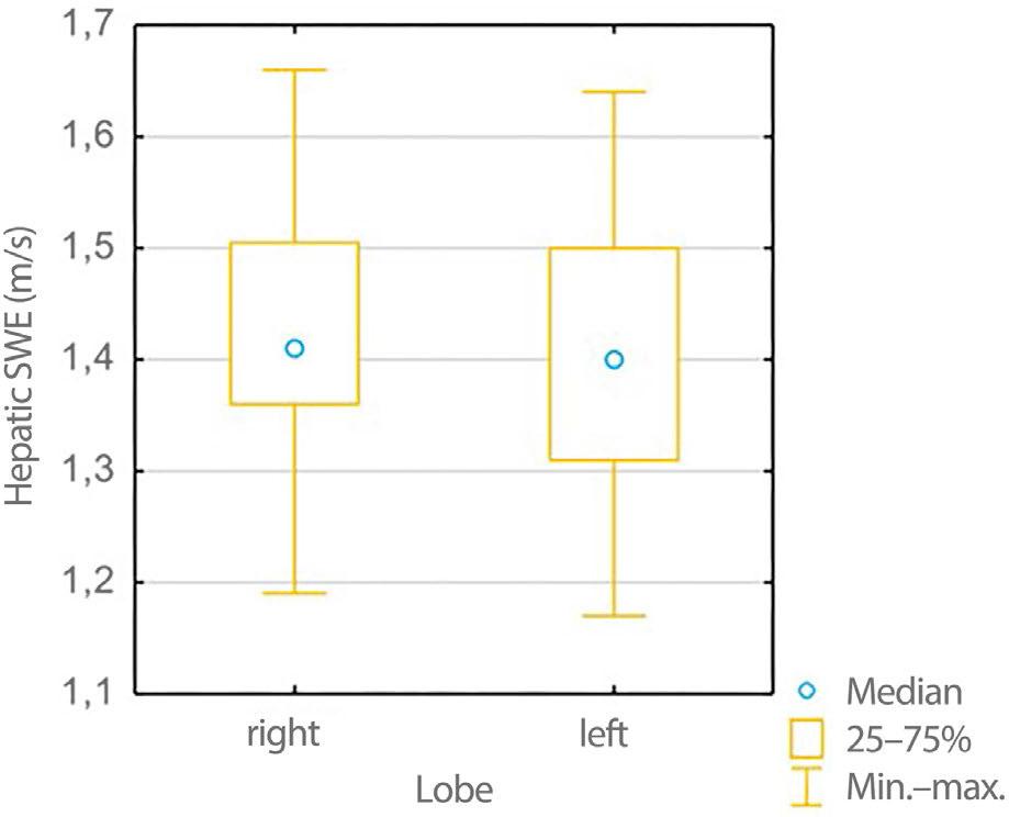 Liver. Comparison of SWE measurements for the right vs left lobe (m/s), p = 0.48