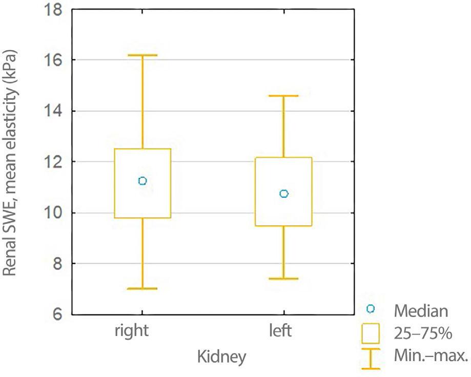 Comparison of SWE measurements for the right vs left kidney (kPa), p = 0.26