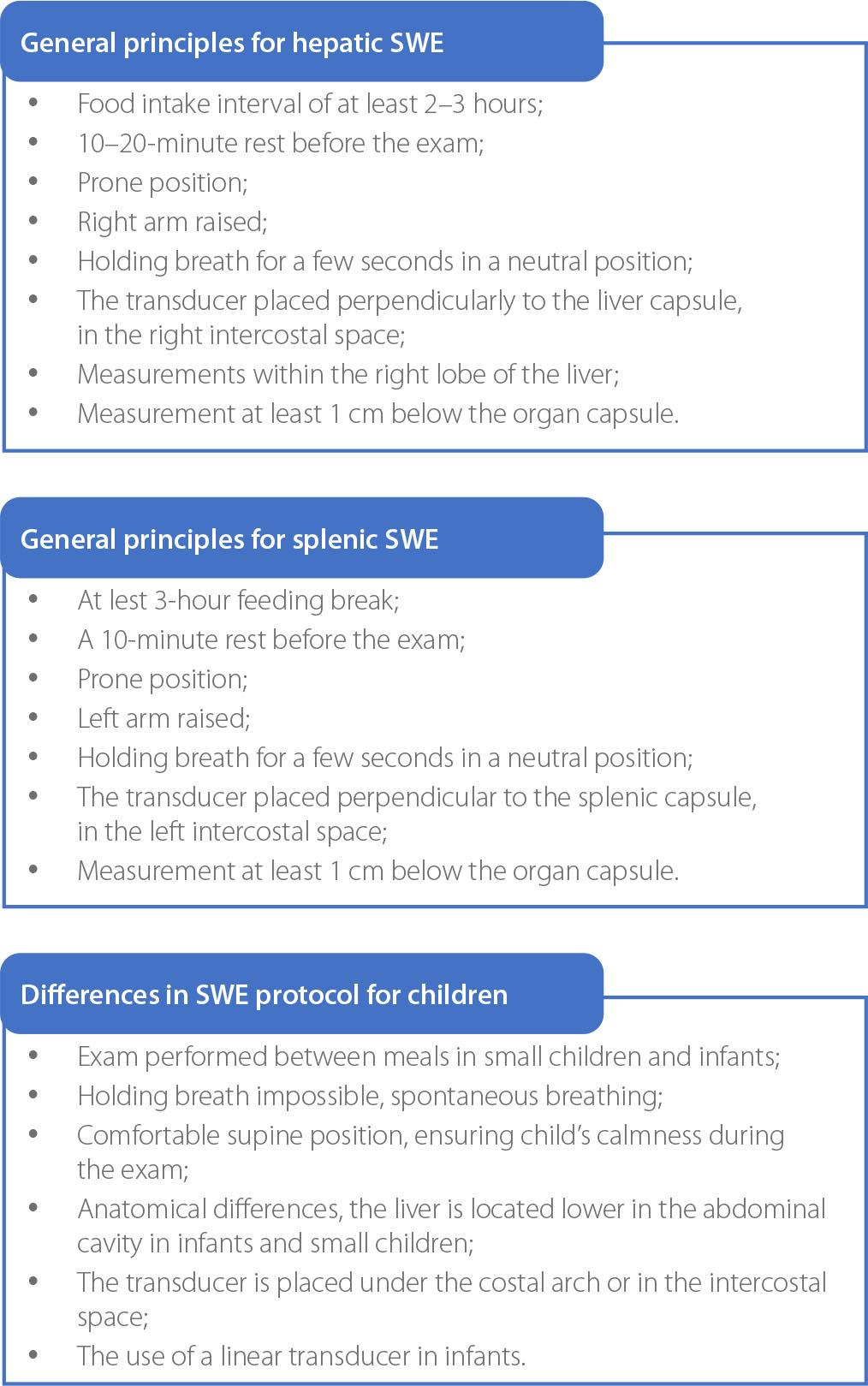 Principles for hepatic and splenic SWE, including the differences in the pediatric population