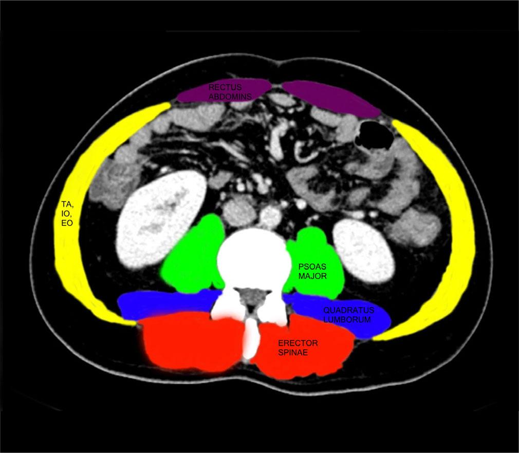 The L3-SMI was calculated from the abdominal CT scan by analyzing a single axial slice at the level of the third lumbar vertebra (L3) (Fig. 2). This region was chosen because it strongly correlates with whole-body muscle mass. Skeletal muscles, including the psoas major, paraspinal muscles (erector spinae and quadratus lumborum), and abdominal wall muscles (rectus abdominis, EO, IO, and TA) were identified and segmented. To differentiate muscle from fat and other tissues, a Hounsfield unit (HU) range of −29 to +150 HU was applied. The total cross-sectional skeletal muscle area (cm2) at L3 was measured using specialized imaging software. L3-SMI was then determined by normalizing this muscle area to the patient’s height squared (m2) using the formula: L3-SMI = Skeletal Muscle Area (cm2) / Height2 (m2). Established thresholds were used to define sarcopenia: less than 42 cm2/m2 for males and less than 38 cm2/m2 for females(8).