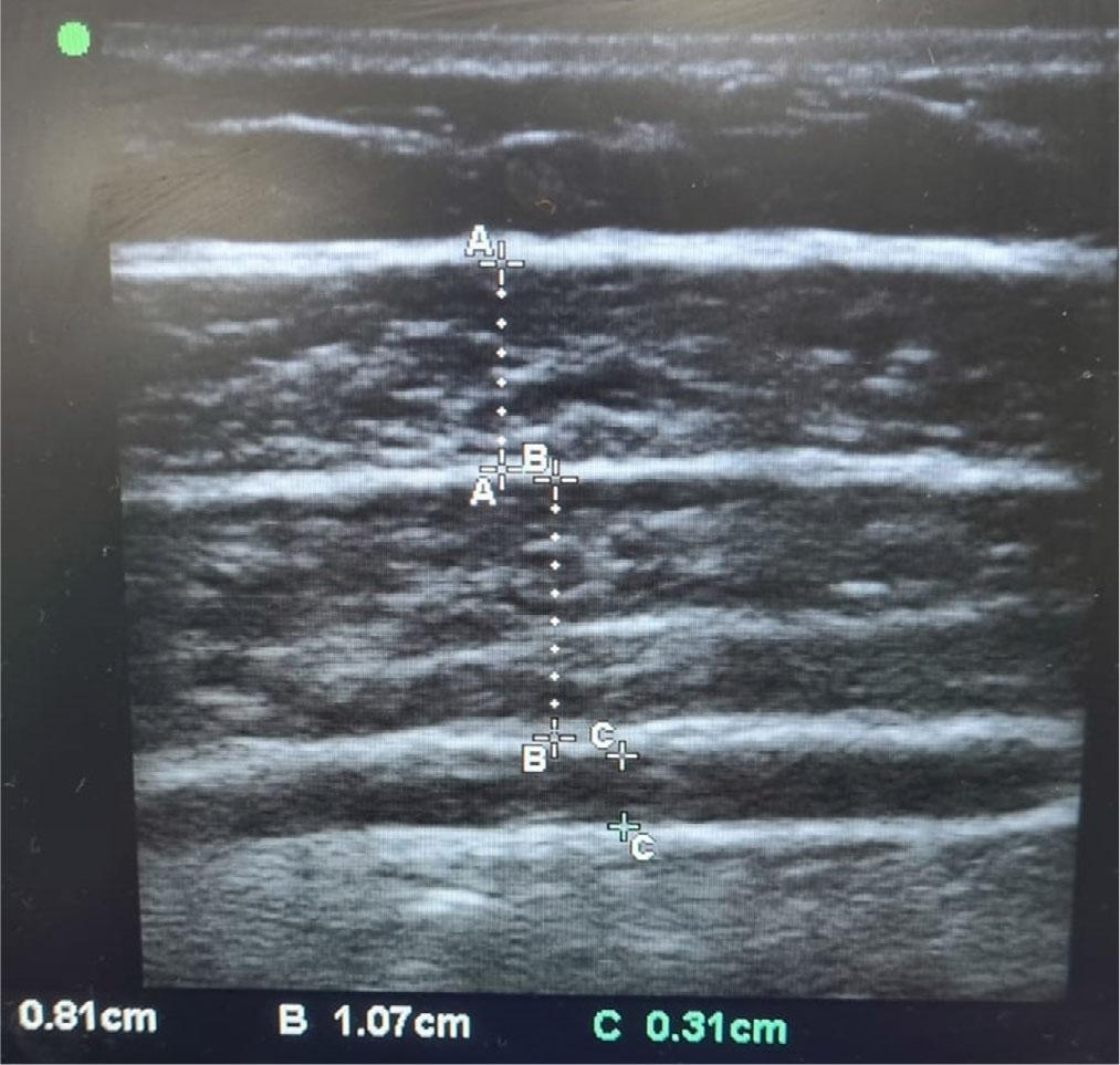 Assessing sarcopenia typically involves methods like computed tomography (CT) and bioelectrical impedance analysis (BIA)(4,5). CT is highly accurate but involves radiation exposure. BIA is non-invasive and easy to use, but can be less accurate, especially in individuals with fluid imbalance. Ultrasonography (USG) offers a promising bedside alternative because of its safety, cost-effectiveness, and accessibility. Despite being operator-dependent, it provides reliable and accurate data on muscle thickness without the risks associated with CT. Eşme et al. have demonstrated its efficacy in assessing the thickness of muscle groups such as the gastrocnemius, rectus femoris, and abdominal wall muscle in sarcoidosis patients(6).