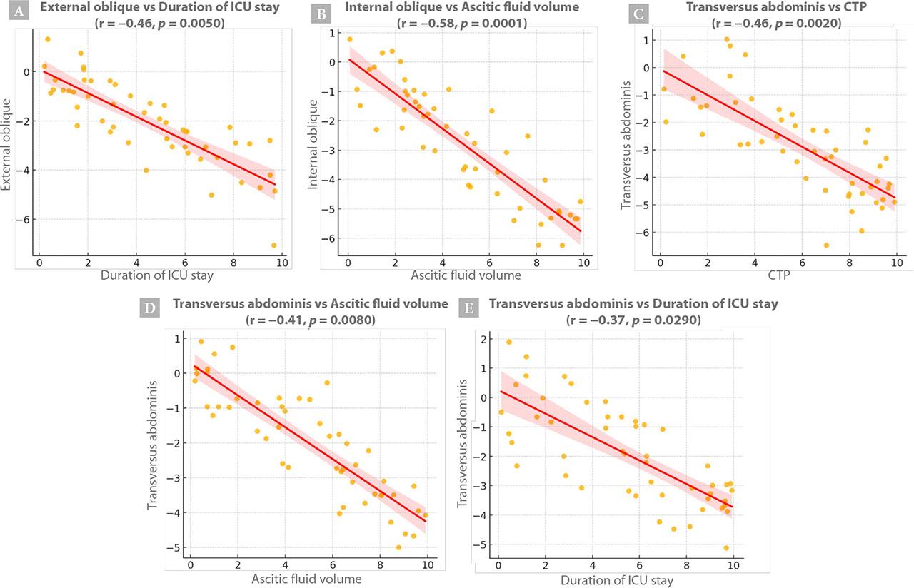 Scatter plots showing correlations between abdominal muscle thickness of EO with (A) duration of ICU, IO with (B) ascitic fluid volume, TA with (C) Child-Turcotte-Pugh (CTP) scores, TA with (D) ascitic fluid volume, and TA with (E) duration of ICU and in liver transplant recipients. P value <0.05 was considered statistically significant. (EO – external oblique; IO – internal oblique; TA – transversus abdominis)
