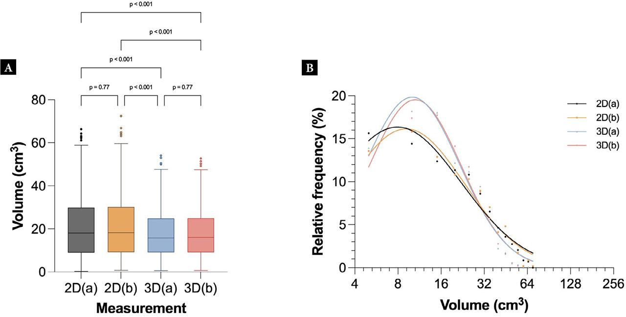 The results showed a similar size distribution between the two 2D datasets and the two 3D datasets, but a significant difference between 2D and 3D measurements. The differences between 2D and 3D were significant across all datasets. The histogram shows that smaller volumes (<30 cm3) were underestimated using 2D, whereas larger volumes (>30 cm3) were slightly overestimated using 2D compared to 3D.