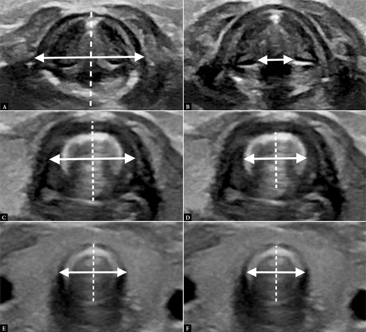 Measurements of: A. laryngeal width (double-arrow line) – transversely from the outer borders of the thyroid cartilage at the level of the glottis; laryngeal depth (dashed line) – sagitally between the outer borders of the thyroid and annular cartilages; B. glottis width (double-arrow line) – between the medial borders of the arytenoid cartilages; C. subglottic width (double-arrow line) – transversely from the outer borders of the annular cartilage; subglottic depth (dashed line) – sagitally from the outer borders of the annular cartilage; the measurements are taken at the level of the arch of the annular cartilage. D. subglottic lumen width (double-arrow line) – transversely from the inner borders of the annular cartilage; subglottic lumen depth (dashed line) – sagitally medially from the inner borders of the annular cartilage; E. tracheal width (double-arrow line) – transversely from the outer borders of the tracheal cartilage; tracheal depth (dashed line) – sagitally from the outer border of the tracheal cartilage to the tracheal muscle membrane; F. tracheal lumen width (double-arrow line) – transversely from the inner borders of the tracheal cartilage; tracheal lumen depth (dashed line) – sagitally from the inner border of the tracheal cartilage to the tracheal muscle membrane