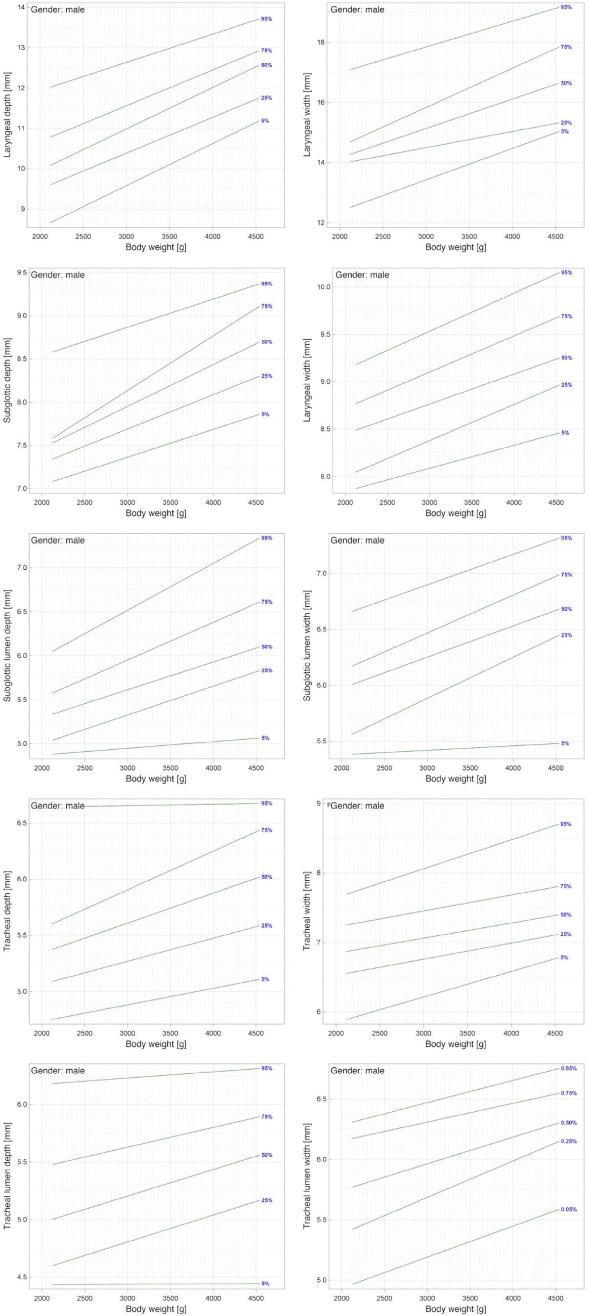 Centile charts illustrating the relationship between the size of the larynx and trachea and body weight in male newborns