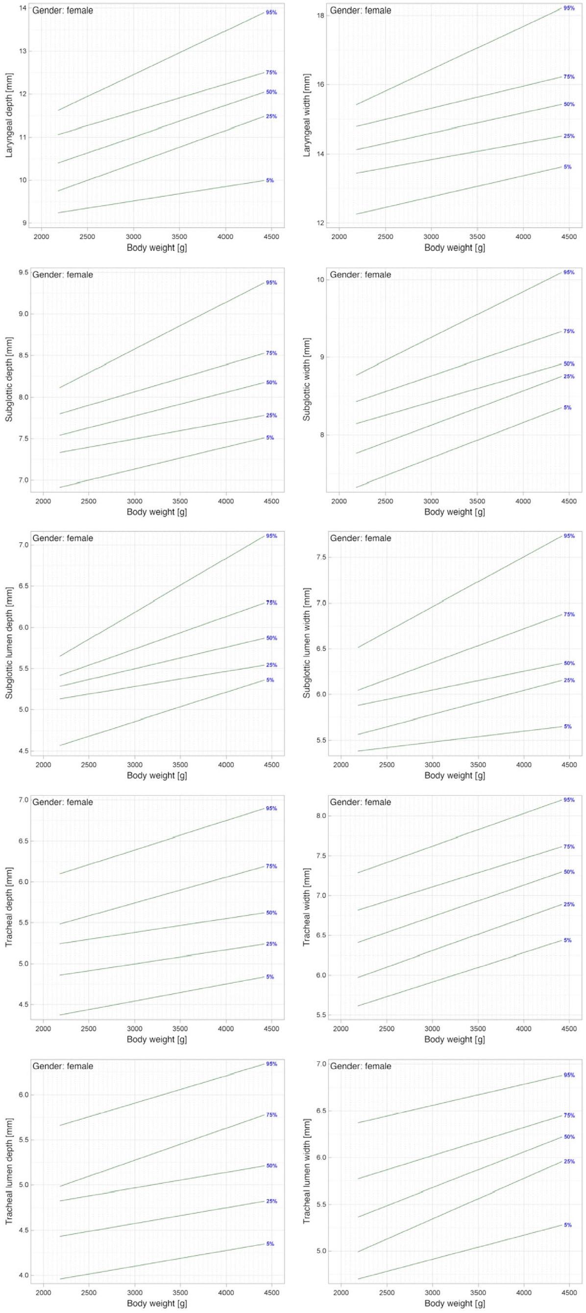 Centile charts illustrating the relationship between the size of the larynx and trachea and body weight in female newborns