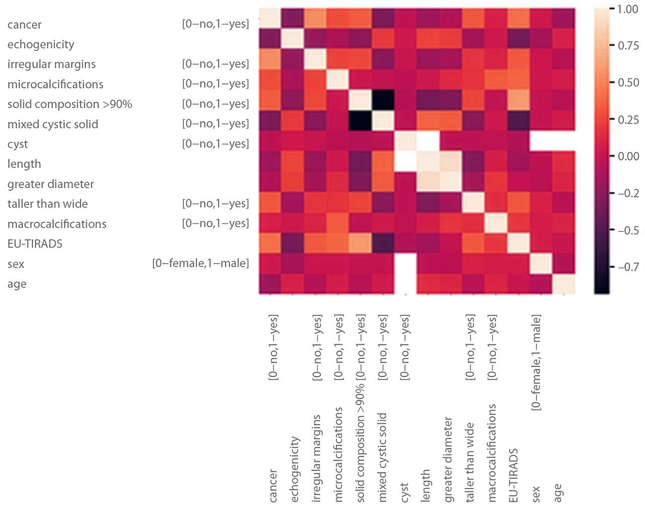 Feature correlation heat map for one of the datasets (14 nodule features). The lighter the color, the stronger the positive correlation; the darker the color, the stronger the negative correlation. The exception is the white color, which indicates that it is impossible to determine the correlation due to insufficient data or a large number of gaps in the set for a given feature