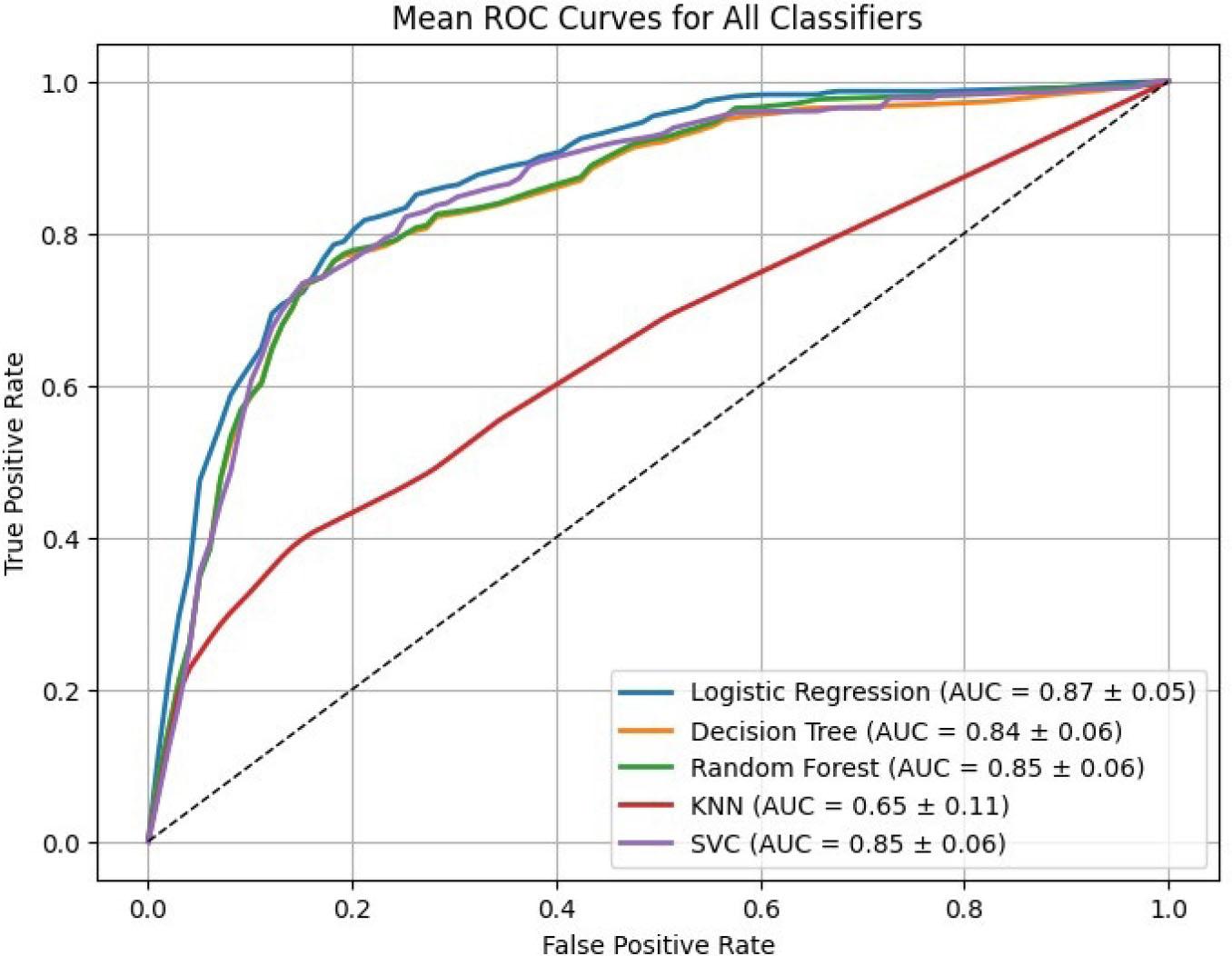 Mean ROC curves for the studied binary classifiers: Support vector machine-based classifier (SVC), Logistic Regression-based (LogReg), Random Forest classifier (RF), and Decision Tree classifier (DT), k-nearest neighbor classifier (KNN)