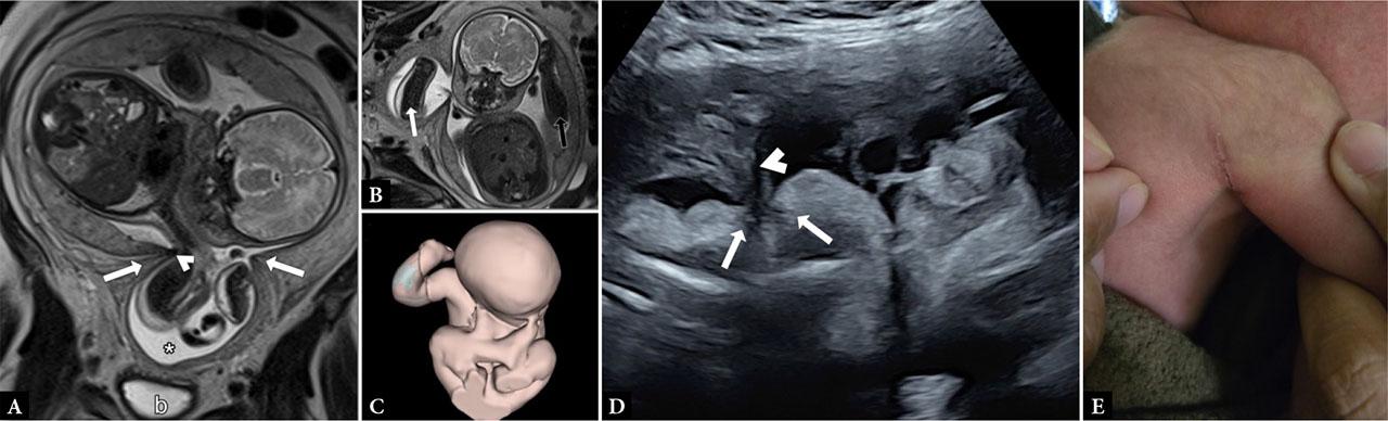 Fetus at 35 weeks of gestation. (A) T2-weighted magnetic resonance imaging (MRI) sequences demonstrate the uterus with a thick myometrial ring separating it into two segments (arrows). The right arm is entrapped in the lower uterine segment (asterisk), with part of the amnion in constant contact with the right axilla (b – bladder). (B) T2-weighted images demonstrate the difference between the left arm (black arrow) and the right arm (white arrow). The right arm shows a hyperintense signal in the subcutaneous tissue, corresponding to localized skin edema. (C) Three-dimensional reconstruction of MRI images of the fetus. The fetal forearm shows edema (blue) and is restricted to the lower uterine segment. (D) Ultrasound image showing the amniotic membrane (white arrows) originating from the uterine constriction ring (arrowhead), rupturing and infiltrating the fetal skin, with striated hypoechoic fibers. (E) Postnatal image of the neonate at the first week of life, showing the scar resulting from the lysis of the amniotic band