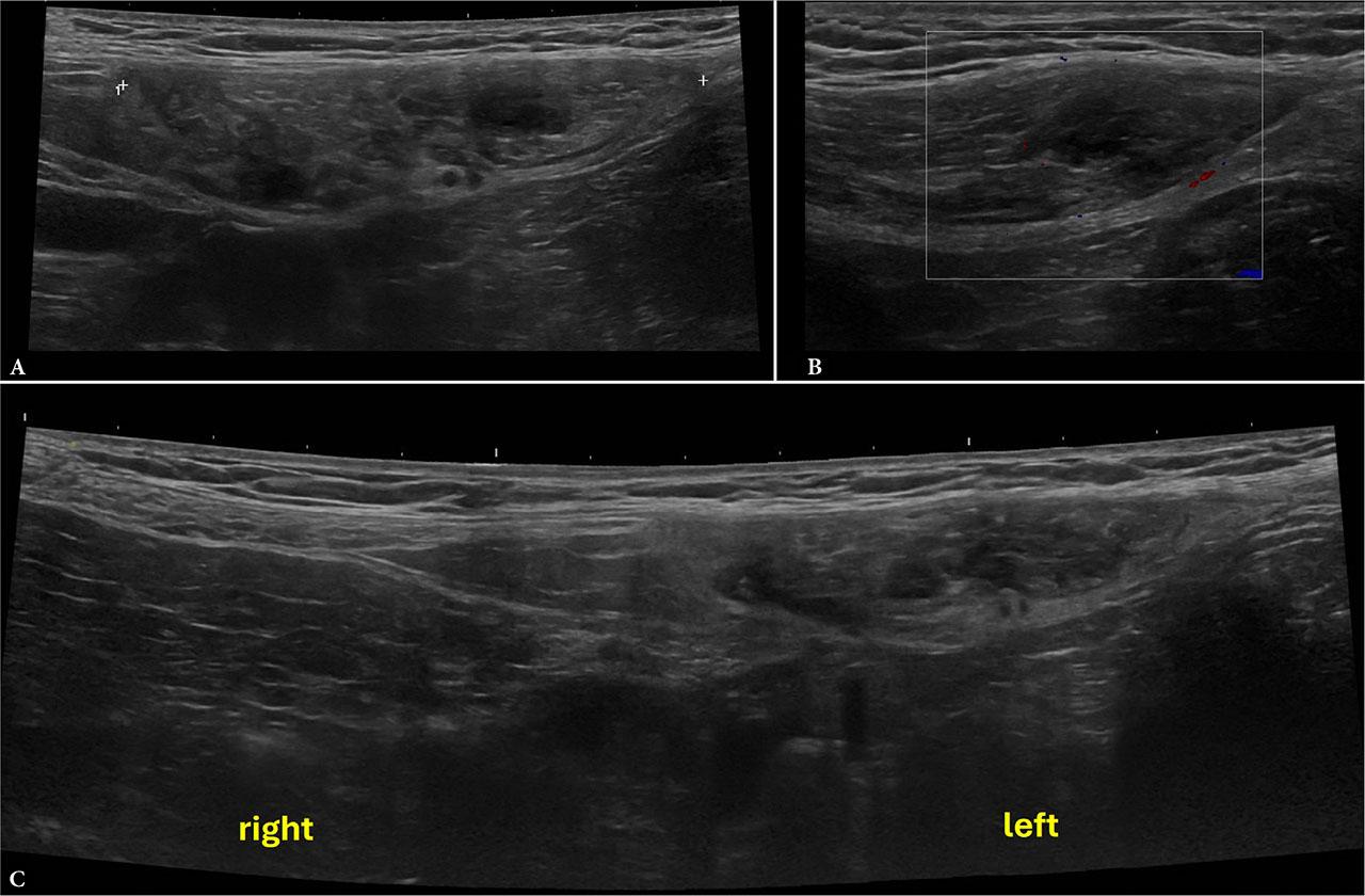 Educational tip: Use the panoramic (extended) view to document the full extent of superficial, large-area lesions, especially in anatomically irregular regions such as the gluteal area. During dynamic scanning, the virtual-convex mode on linear probes can widen the lateral field of view in real time; however, detailed margin and vascular assessment should be rechecked in standard linear mode. CD helps exclude evolving infection, whereas a corpuscular echostructure without internal flow supports the diagnosis of a subacute hematoma.