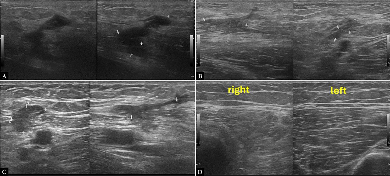 Ultrasound of the right rectus femoris muscle showing a heterogeneous hypoechoic lesion (1.2 × 1.6 × 2.7 cm) without internal flow on CD (A). Follow-up examinations at one (B) and four weeks (C) demonstrate progressive reduction in size (from 1.2 × 1.3 × 1 cm to 1.3 × 0.5 cm) and increasing echogenicity, consistent with resorptive hematoma evolution. Mild subcutaneous tissue edema persisted throughout the follow-up period. Comparative imaging (D) highlights muscle asymmetry and echotextural inhomogeneity, suggestive of evolving structural remodeling