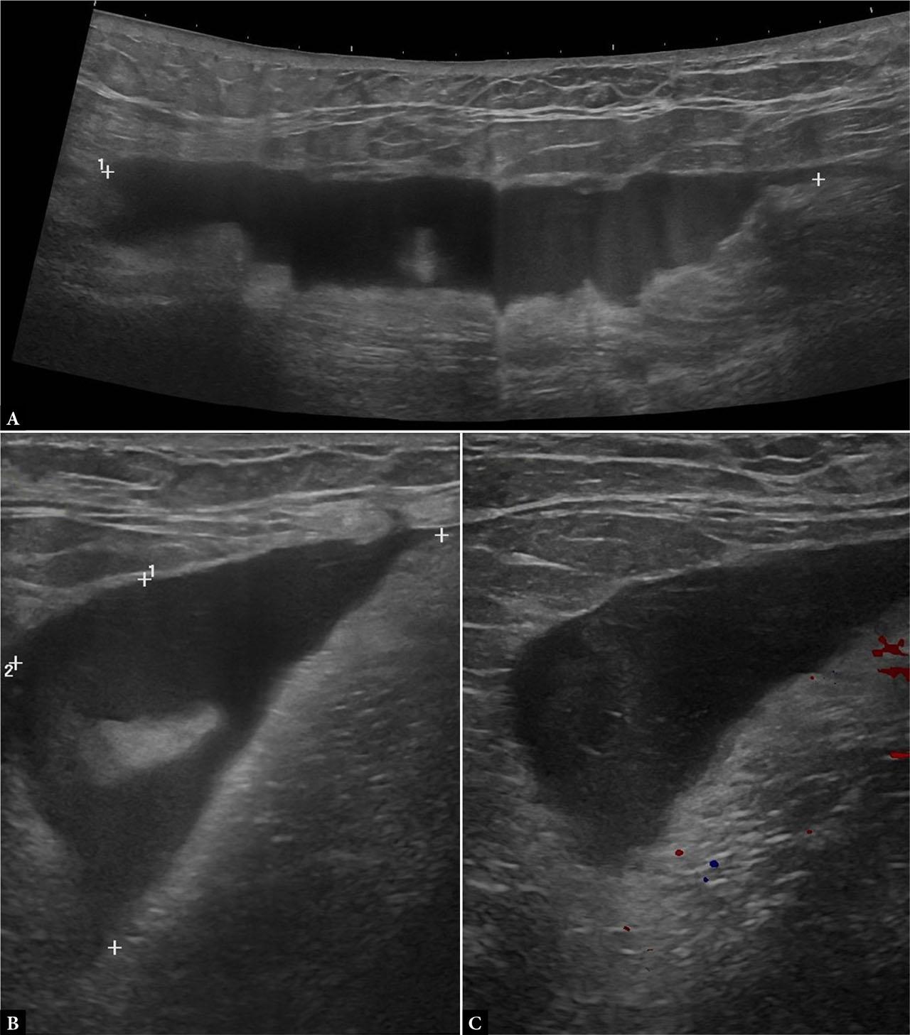 Ultrasound of the right gluteal region demonstrating a large subcutaneous anechoic collection (13.6 × 4.9 × 5.9 cm) with internal particulate content (A, B) and no flow on CD (C), consistent with a subacute hematoma