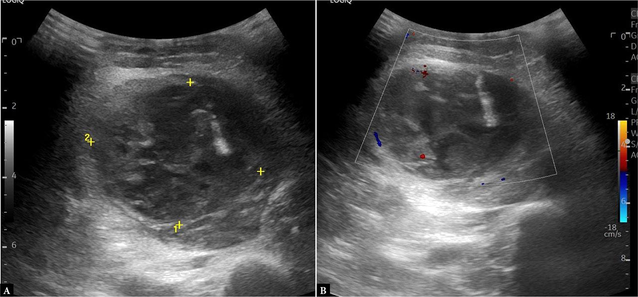 | Chronic/organized | >3–6 weeks | Well-defined margins; hypoechoic or mixed echogenicity with capsule; possible peripheral calcifications or echogenic septa | Absent internal flow; thin peripheral vascular rim may be reactive |