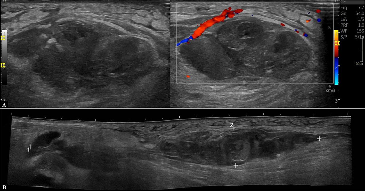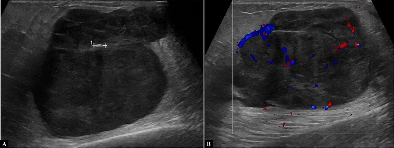 Ultrasound of the medial aspect of the right lower leg showing a large polylobulated subcutaneous mass (5.3 × 4.2 × 7.4 mm) with internal septations and a small calcification (A). CD imaging demonstrates both peripheral and internal vascularity (B), consistent with a soft-tissue sarcoma