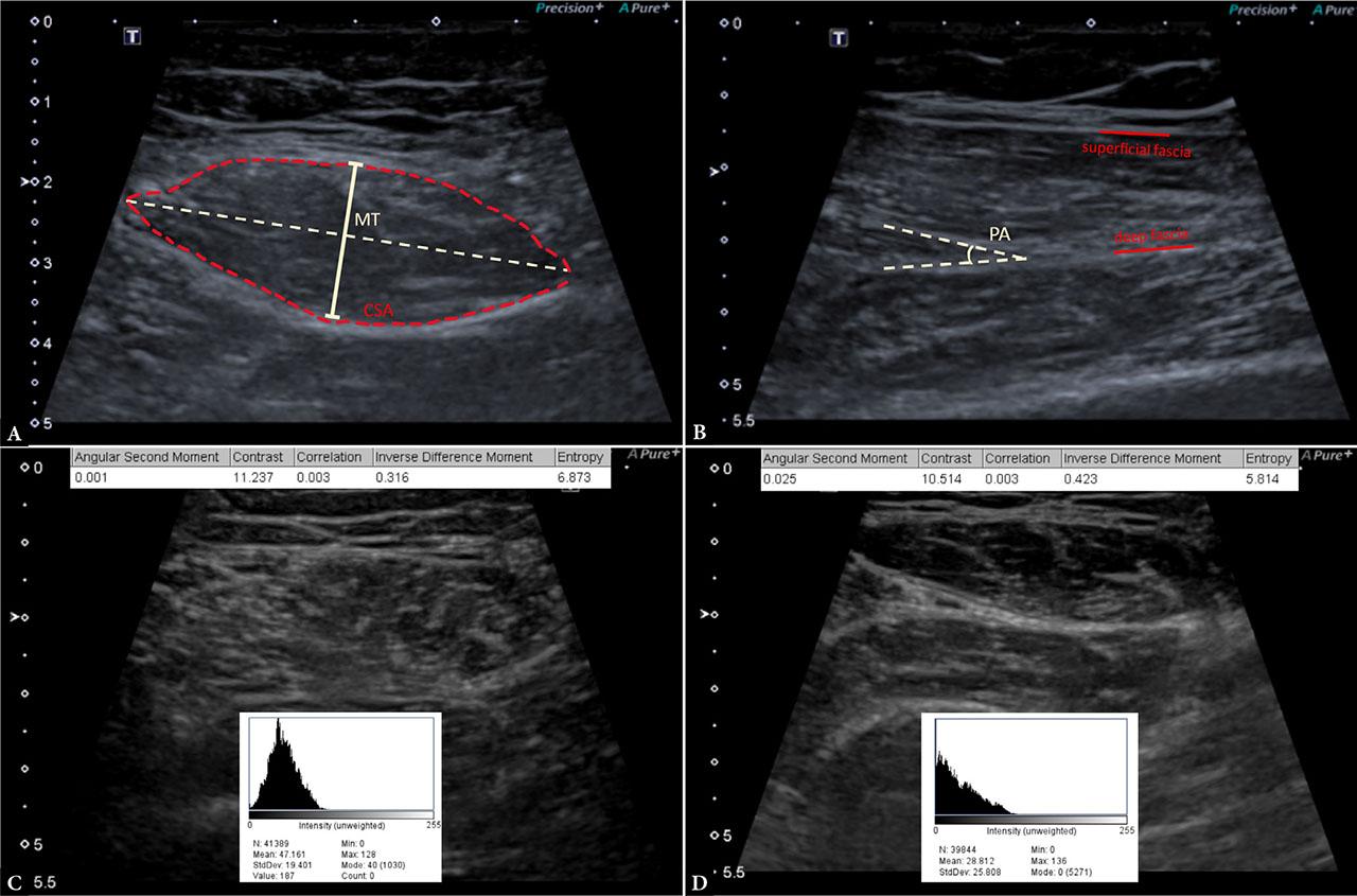 Example of ultrasound measurements of the rectus femoris (RF) muscle: A. the pennation angle (PA) was obtained in the long-axis view and measured between lines drawn along the deep muscle fascia and the muscle fascicle; b) RF thickness (MT) and cross-sectional area (CSA) were measured in the short-axis view, the former represented by the maximal vertical distance between the superficial and deep fascia layers, the latter calculated after outlining the muscle’s boundaries; C and D. echogenicity and gray-level co-occurrence matrix (GLCM) features were measured in the short-axis view: a square region of interest (ROI) was selected, and the following texture parameters were calculated using ImageJ software: mean pixel intensity, angular second moment (ASM), contrast, correlation, entropy, and inverse difference moment (IDM); C. muscle image from a patient in the “probable sarcopenia” group; D. muscle image from a patient in the “no probable sarcopenia” group