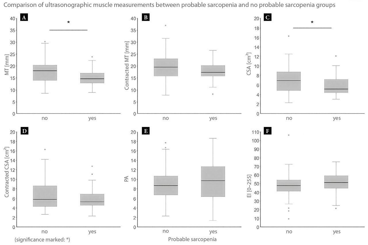 Comparison of ultrasonographic muscle measurements between the “probable sarcopenia“ and “no probable sarcopenia“ groups generated using R Statistical Software (v4.4.2; R Core Team 2024); Y-axis labels represent selected ultrasonographic measurements of the rectus femoris muscle; X-axis labels indicate comparison groups: patients without probable sarcopenia (“no”) and those with probable sarcopenia (“yes”). Effect sizes with 95% CI and statistical power (%) for comparisons between “probable sarcopenia“ and “no probable sarcopenia“ groups: A. 0.62 (0.16, 1.08), 78%; B. 0.52 (0.06, 0.98), 62%; C. 0.56 (0.10, 1.02), 65%; D. 0.35 (−0.11, 0.80), 31%; E. −0.16 (−0.62, 0.29), 10%; F. −0.27 (−0.72, 0.19), 20%; * p <0.05 (Mann–Whitney U test), adjusted for multiple comparisons using the false discovery rate (FDR) procedure. MT – rectus femoris muscle thickness (mm); CSA – rectus femoris muscle cross-sectional area (cm2); PA – pennation angle (°); EI – echogenicity: grayscale intensity of muscle tissue expressed in arbitrary units (AU), 0 – black, 255 – white, with higher values indicating poorer muscle quality