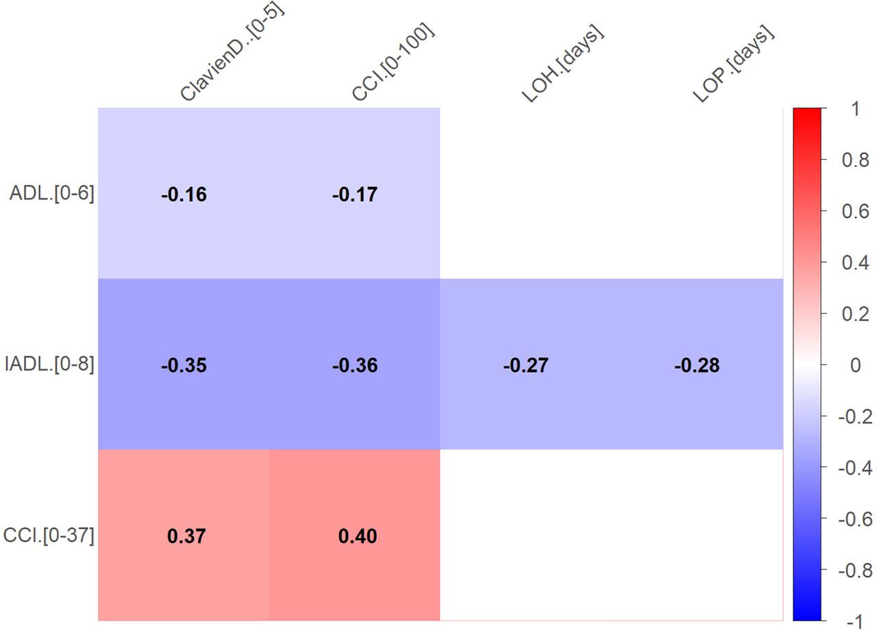 Correlations between postoperative course, complication severity and components of the comprehensive geriatric assessment determined using R Statistical Software (v4.4.2; R Core Team 2024). Cell values represent Spearman’s rank correlation coefficients calculated using pairwise complete observations. Only correlations that remained statistically significant after adjustment for multiple comparisons using the false discovery rate (FDR) procedure are shown. ADL – activities of daily living; I-ADL – instrumental activities of daily living; CCI (0–37) – Charlson comorbidity index; ClavienD. (0–5) – Clavien-Dindo classification grade; CCI (0–100) – comprehensive complication index; LOH (days) – length of hospitalization; LOP (days) – length of postoperative stay