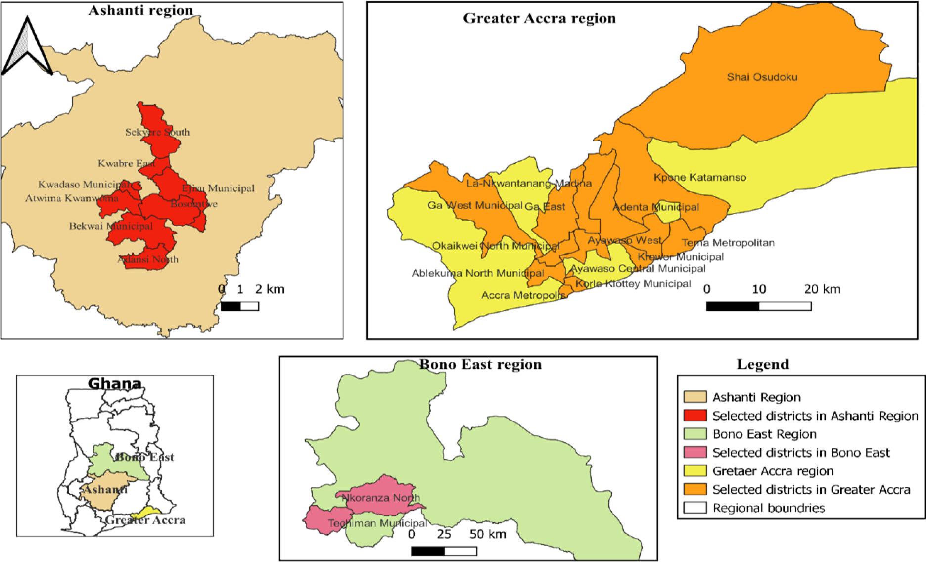 The study was carried out in three regions of Ghana; Greater Accra, Ashanti and Bono-East region. The regions were selected because they are the regions where the bulk of mushrooms are produced in the country and, invariably, the regions with the highest number of mushroom consumers. According to data from the Mushroom Growers and Exporters Association of Ghana (MUGREAG), Bono-East region is the largest producer, followed by Greater Accra and Ashanti region. The Greater Accra region is the seat of government and the regional capital city is Accra, which is also the capital of Ghana. The region has 29 districts. It is the most populated region with a population size of 5,455, 692 (GSS, 2021). It is also the most urbanised region in the country, with 87.4% of its population living in urban areas (Songsore, 2009). Ashanti region is the second most populous region, with a population size of 5,440,463 (GSS, 2021). The region is the second most urbanised region in the country after Greater Accra region. The region has a total of 43 districts. Bono East region is one of the newly created regions. The capital of the region is Techiman. The region has a total population size of 1,203,400 (GSS, 2021). The region has eleven districts. Agriculture is the main economic activity in the region. The main crops grown include yam, cassava, cocoyam, beans, rice and plantain. Fig. 1 shows the map of the study areas where the respondents were sampled.