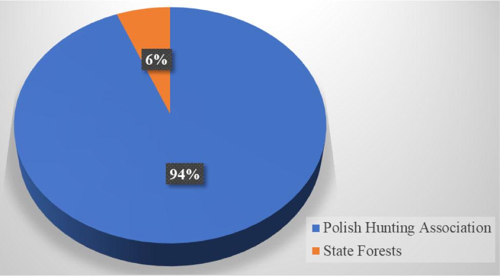 Currently, all activities related to hunting management in Poland are carried out by two institutions. The first and dominant one is hunting clubs, associated in one nationwide organization, the Polish Hunting Association. The second one is the State Forests Administration. All activities in this area are carried out in administratively separated areas, such as hunting districts. In turn, the division into hunting districts is made by way of an act of local law, i.e. a resolution of the competent assembly of the voivodeship to which the division applies. One rather important issue is the fact that the area of hunting districts cannot be less than 3,000 hectares, which is important mainly for ecological reasons in terms of the functioning of the population of individual game species, especially large game. There are almost 5,000 hunting districts in the country, the vast majority of which are leased by hunting clubs, with the rest are managed as game breeding centers (Fig. 1).
