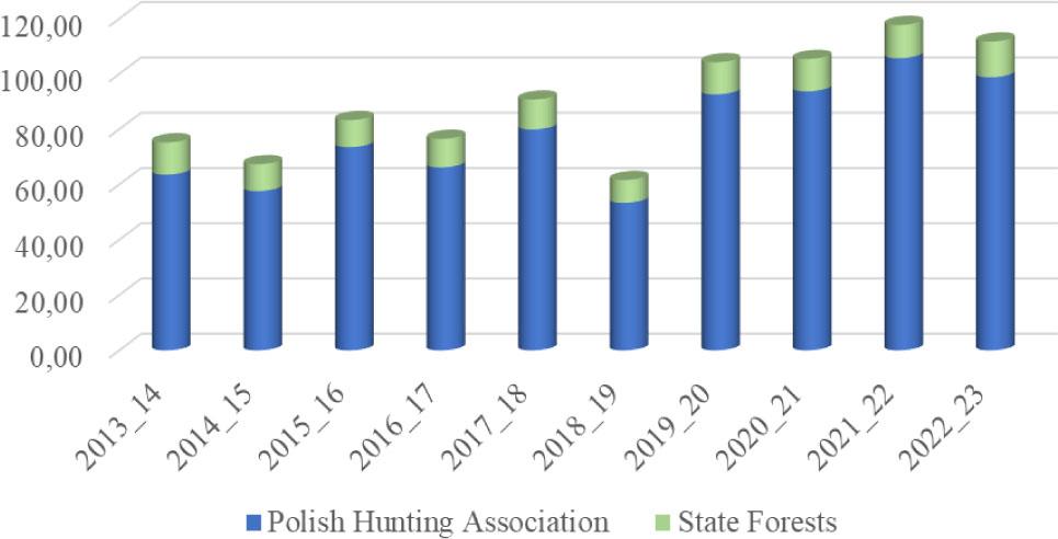 Due to the possibility of managing individual areas (lease management) not owned by hunters, these entities pay rent each year, known in hunting as a tenancy fee. The lease fee is paid to the communes and municipalities within which the hunting grounds are located. This amount is set annually, and takes into consideration the hunting category of the grounds and the price of rye. In the 2022/23 hunting season, hunting entities paid a total of PLN 22.3 million of these liabilities. The amounts paid annually in rent go to the budgets of local governments, not landowners, which has been quite widely criticized in recent years and even leads to conflict situations in some cases (Flis, 2023b).