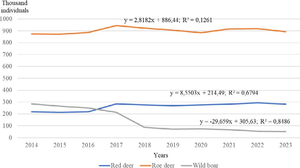Dynamics of the abundance of red deer, roe deer and wild boar over the last decade