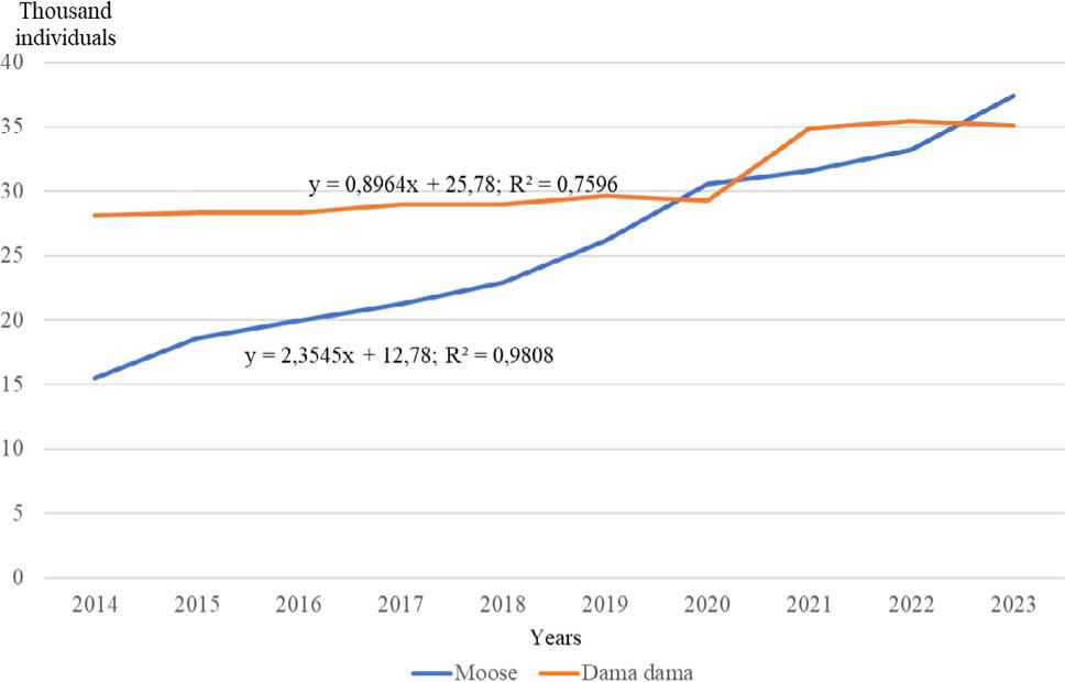 Dynamics of the abundance of moose and fallow deer over the last decade