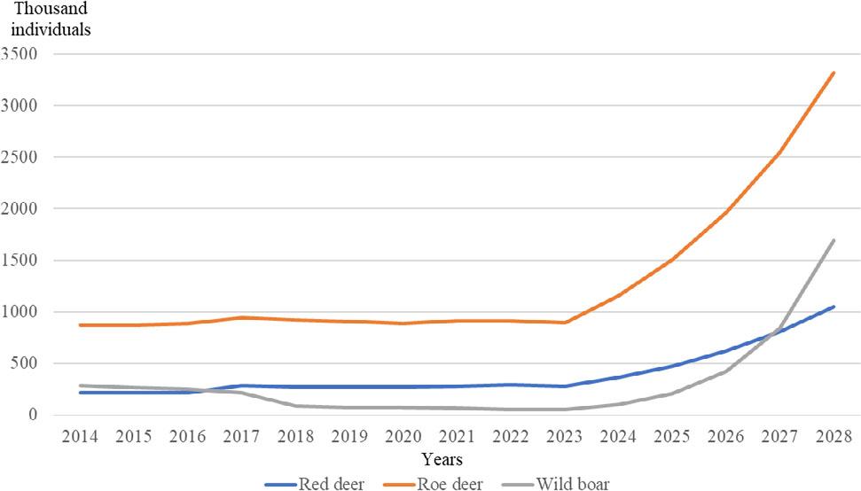 Forecast of red deer, roe deer and wild boar numbers for the next 5 years, with the cessation of annual shooting