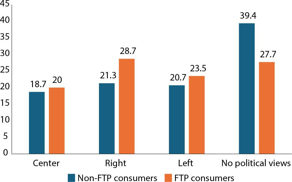 The data (Fig. 9) show that FTP consumers are more politically engaged compared to non-FTP consumers. Over 72% of FTP consumers were able to express their political views, whereas only 60% of non-FTP consumers could do the same. Among FTP consumers, 29% identified as right-leaning, 24% as left-leaning, and around 20% as centrist.