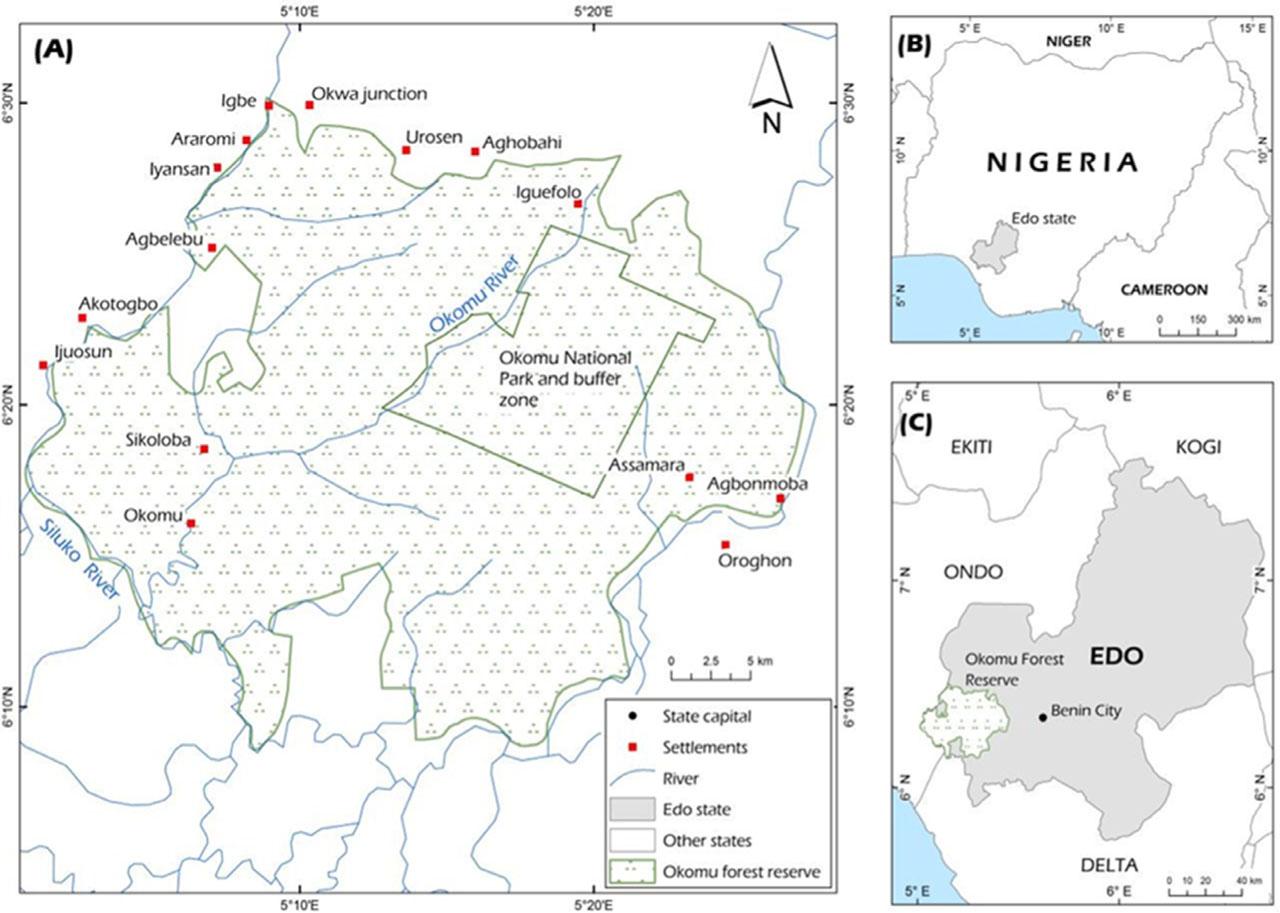 Map of study area showing the Okomu Forest Reserve (A) and insert maps Nigeria showing Edo state (B) and Edo state showing the Okomu Forest Reserve (C)